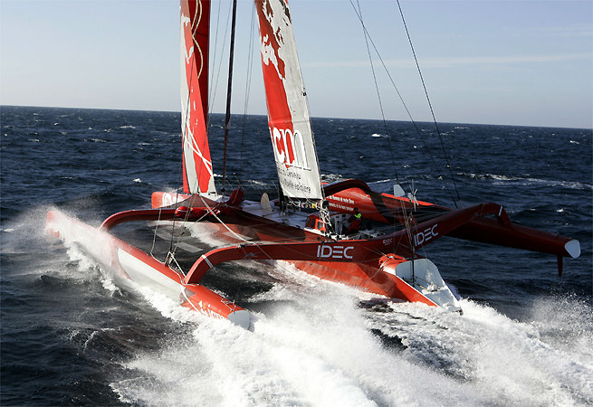 Francis Joyon s’attend donc à être ralenti d’ici l’arrivée. On comprend mieux pourquoi il est « très content » d’avoir aujourd’hui une avance qui n’est donc que faussement confortable. Qu’il soit à une ou plusieurs coques, en flotte ou en record, on sait depuis longtemps que tant que la ligne n’est pas franchie, rien n’est jamais gagné d’avance. Pour le moment « le bateau travaille beaucoup, dans du vent portant mais avec une grosse houle de nord-ouest. Je suis donc un peu malheureux pour lui, mais du côté du marin tout va bien ». IDEC a suivi la rotation du vent au nord-est, derrière le front. Côté vie à bord, « j’ai réussi à trouver un rythme de sommeil qui me convient ». Et est-ce que le Joyon est toujours aussi heureux sur l’eau ? Le pilote d’IDEC a une pirouette pour cette question : « Ah oui, ça oui ! On imagine que la vie du navigateur solitaire est spartiate et horrible, mais il y a des moments sympas aussi : quand le bateau glisse bien sur la mer, qu’il y a de belles lumières sur l’eau, que la couleur de l’océan est magnifique, comme en ce moment… Pour résumer, on va dire qu’au niveau confort on est très loin de la vérité, mais d’un point de vue esthétique on approche tout de même du bonheur par la beauté des éléments qui nous entourent. » Du Joyon dans le texte.