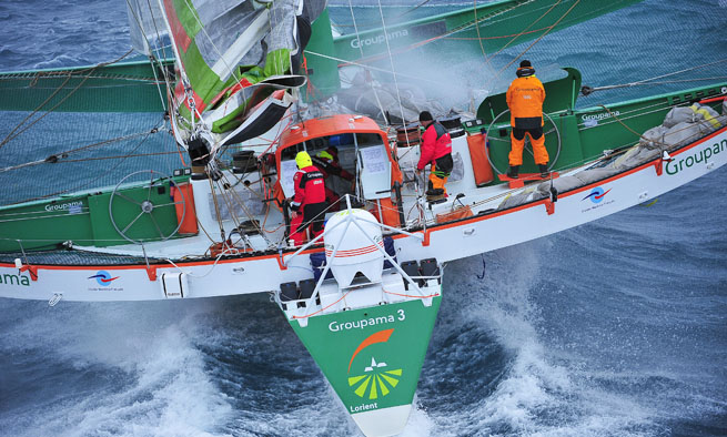 Ce bord de deux heures pour éviter le dévent du Tope de Coroa (1 979 m) était suivi d’un autre recadrage deux heures plus tard pour aller chercher ce fameux 28° Ouest, point d’entrée pour passer le Pot au Noir. Ce n’est qu’en fin d’après-midi que Franck Cammas et ses neuf équipiers devaient engager un dernier empannage pour faire route directe, plein Sud vers l’équateur. Groupama 3 restera ainsi un long moment en bâbord amure puisque derrière l’équateur, ce sont des vents réguliers de secteur Sud-est puis Est qui l’attendent.