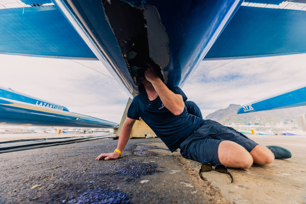 « En sortant le bateau, on a pu constater l’ampleur des dégâts. Au vu de la taille de l’ouverture dans le fond de coque, on estime qu’il n’est pas envisageable de pouvoir repartir en course. Cela nécessiterait des travaux lourds, très longs et nous n’avons pas forcément la capacité de les faire ici. Nous nous dirigeons donc vers un abandon. »