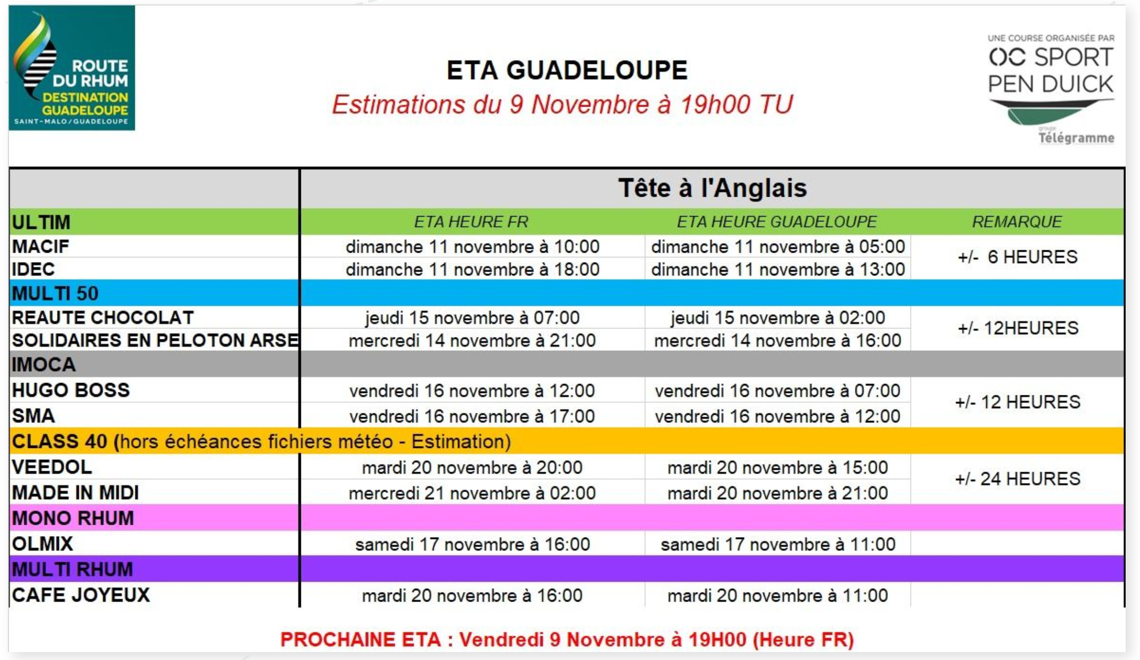 Les premières ETA donnent une arrivée pour Francois Gabart dimanche matin vers 11h. Les premiers Multi50 sont attendus jeudi 5 novembre le matin. En Imoca le vendredi 16 novembre à 12h et Class40 le mardi 20 novembre.
