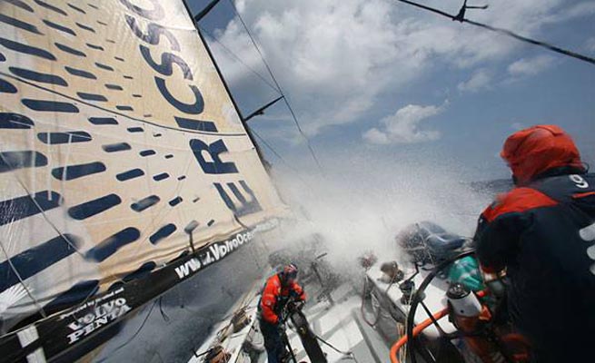 aujourd’hui. Cette compression s’effectue sous la chaleur des tropiques et fait grimper les niveaux de stress à bord du bateau bleu. Bien que très proches sur les relevés de positions, les deux Ericsson et Puma  occupent en fait des positions assez distinctes sur l’eau. Ericsson 4 et Ericsson 3 ont pris le parti de naviguer un peu dans l’est de la route de Telefonica Blue alors que Puma s’est un peu détaché dans l’ouest en prenant une position d’attaque différente. La décision d’Andrew Cape sur Puma de prendre une route à l’est des autres à la sortie du Pot au Noir a porté ses fruits ce week-end. Personne ne sait encore si les Américains ont eu raison d’avoir choisi cette option, mais le skipper Ken Read semble confiant et surtout satisfait de n’avoir plus la pression de naviguer à vue des redoutables vikings.