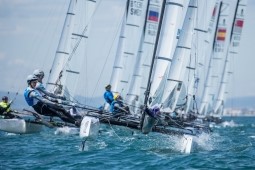 Santi Lange (ARG), champion olympique de Nacra 17 : “On est super contents de retrouver le bateau et la compétition. Avec Cécilia, c’est notre première régate depuis les Jeux. On aurait voulu s’entraîner plus mais Cécilia s’est blessée et n’a pas pu naviguer pendant 25 jours. Mais on a travaillé dur pour essayer de se rattraper. Ce bateau est incroyablement difficile et on a beaucoup à apprendre. Je crois qu’on a dû naviguer 18 jours avec. On a encore un peu de mal au portant. On verra. Le principal challenge c’est d’arriver à naviguer avec des foils sur des plans d’eau ouverts et une mer agitée. Mais il faudra s’y mettre car nous voulons aller à Tokyo. Je me réjouis de voir une nouvelle génération arriver. C’est une de mes motivations : naviguer contre ces jeunes gars. Il y a plein de nouveaux talents. Le foils, d’une certaine manière, c’est un autre sport. A ce titre, ce Championnat est différent des précédents. En tant que compétiteur, cela va de soi qu’on aimerait gagner, mais nous sommes surtout là pour apprendre et nous serons prudents ».