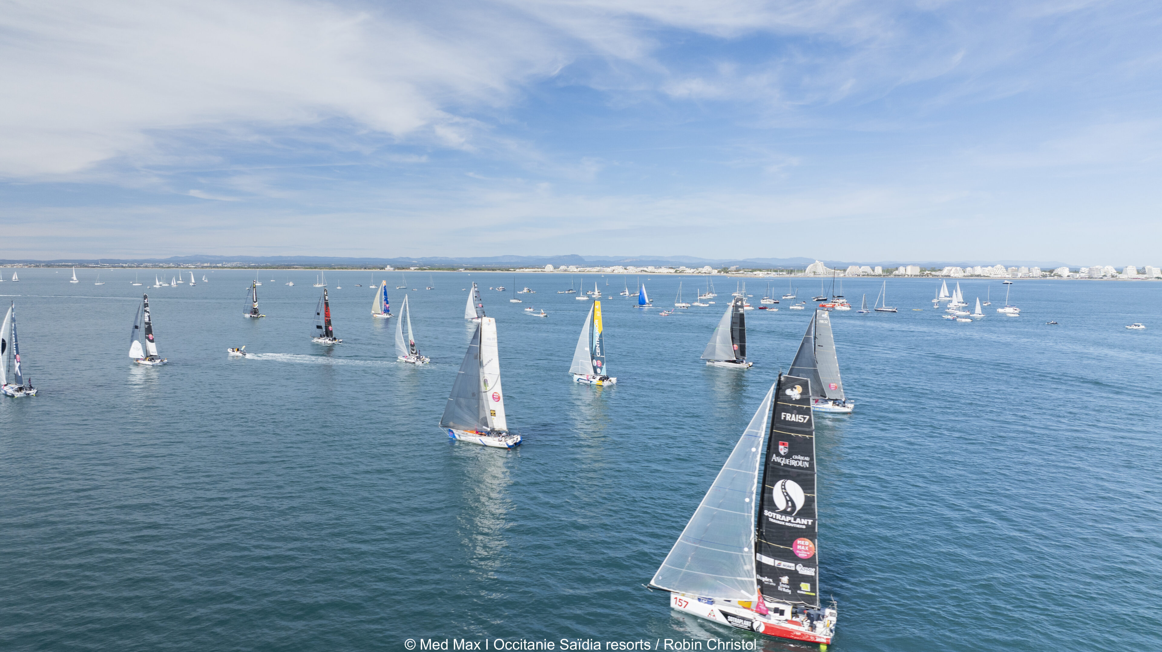 À la sortie de Port Camargue régnait une ambiance aux airs des mythiques grandes courses au large : des hourras et applaudissements à chaque bateau qui lâchait les amarres : c’était la fête des marins et des terriens, en ce dimanche ensoleillé sur le Grau du Roi Port-Camargue, un au revoir chaleureux à ces skippers porteurs de rêve. À la mi-journée, la baie d’Aigues-Mortes fourmillait d’embarcations venues des ports du littoral d’Occitanie, pour rejoindre la horde de bateaux de sécurité, médias et partenaires pour accompagner ces vingt-cinq duos et leurs fabuleuses montures, prêtes à lâcher les « chevaux » au coup de canon de 13 heures.