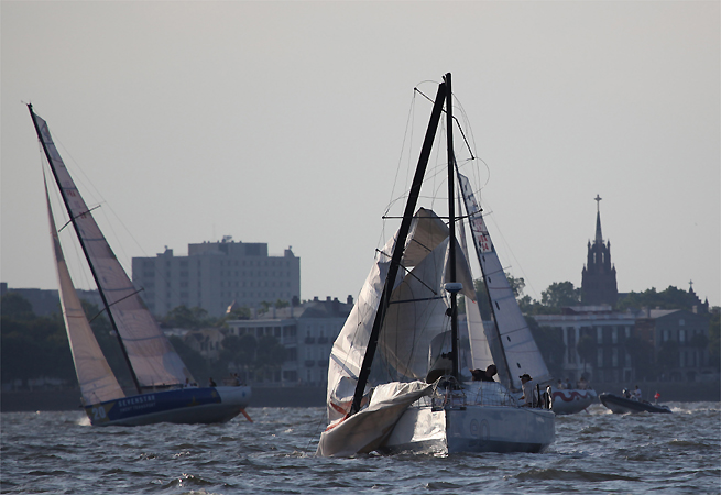Moins de 5 minutes après le départ de l’Atlantic Cup du port de Charleston hier, le Class40 de Hannah Jenner et Peter Harding, 40 Degrees a démâté suite à la rupture d’un hauban. L’incident a surpris Jenner, car la mer était plate hier soir lors du départ. Le duo espère pouvoir remâter le monocoque afin de prendre le départ de la prochaine étape de New York. Ce samedi à 17h, ce sont Halvard Mabire et Miranda Merron qui mènent la flotte sur Campagne de France à 495 milles de l’arrivée de la première étape à New York. Ils disposent d’une avance de 3 milles sur Eole Génération – GDF Suez mené par Sébastien Rogues et Jeff MacFarlane et de 9 milles sur Gryphon Solo skippé par Joe Harris.