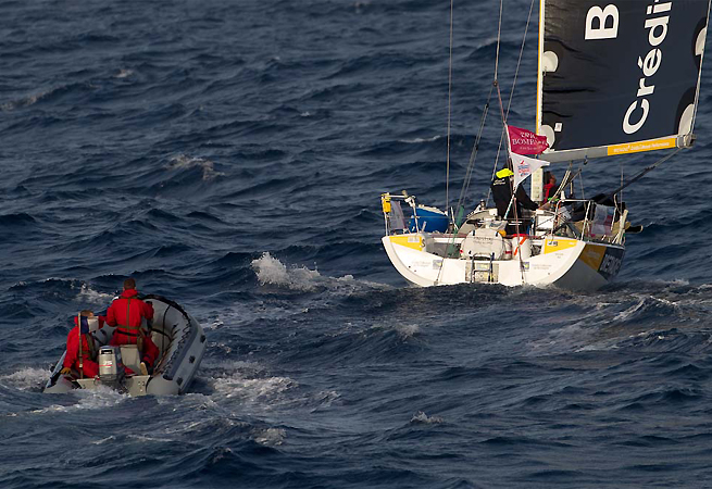 Gilles Chiorri (directeur de course) nous explique ce qui se passe : ” Hier soir à 22h53, nous avons reçu un appel par VHF pour informer la direction de course et le bateau médical d’une douleur persistance quand il manoeuvrait. Il s’est alors réfugié à l’intérieur du bateau. Immédiatement le docteur Jean-Yves Chauve s’est employé à soulager Anthony et il s’est dérouté sur la zone selon les instructions. Toute intervention cette nuit du fait de la brume épaisse et des conditions de vent sur la zone était rendue impossible. On a mené de façon régulière une administration et médication dans la nuit pour soulager les douleurs. Au petit matin les douleurs persistantes ont conduit le skipper à demander une assistance à bord, et c’est le bâtiment de la Marine nationale, qui a transféré un équipier de GMF Assistance à bord du Figaro, ceci étant effectué dans un temps record et dans des conditions de vent et de mer difficiles avec 25 nds et une houle de 1,5m. A 7h50 le transfert de l’équipier était réussi et la situation était sous contrôle. Anthony Marchand est à présent dans sa bannette et tout se passe bien pour l’instant. Bretagne Crédit Mutuel Performance devrait arriver sur Gijón à 21h heure local. »