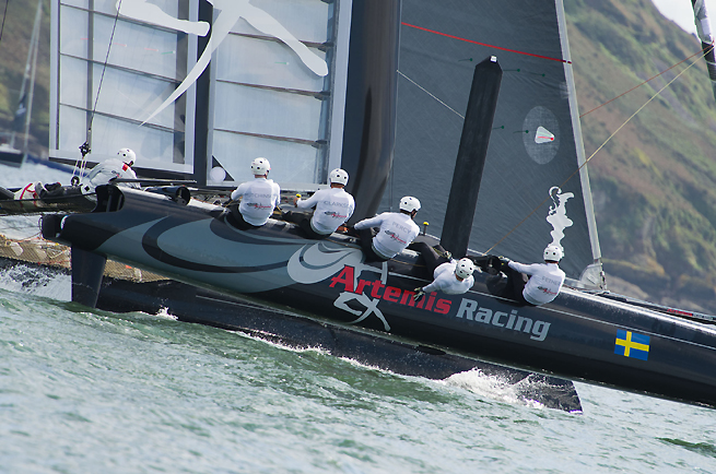 Coutts rencontre Artemis pour disputer la troisième place. Souci de gennaker sur Oracle Coutts. Le leader suédois creuse son écart à 160m sur le premier bord de près. Mais à la fin du bord, Coutts réduit significativement son retard à 14 secondes de retard à la porte au vent. Hésitation à la marque sous le vent de Hutchinson et ses hommes. Coutts n’a plus que 20m de retard. A la limite du parcours, Coutts croise devant les Suédois. Match très serré. Peu avant la cinquième porte, pénalité pour Coutts qui sort du parcours! Coutts tarde à effectuer sa pénalité et la pénalité se prolonge permettant à Artemis de cavaler en tête avec 450m d’avance sur le dernier bord de portant. Victoire d’Artemis – delta de 54s. Artemis prend la troisième place dans ce championnat de match racing à Plymouth.