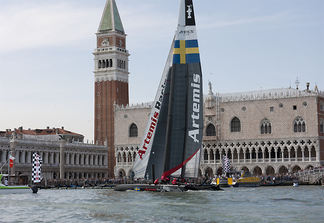 Ce dimanche, la finale du Championnat de Match Racing ouvre le bal à Venise. Le titre se joue en une manche gagnante entre Artemis Racing et Luna Rossa – Piranha. La brise est très faible avec moins de 5 noeuds sur le plan d’eau. A 14h45, .Artemis prend le meilleur départ avec deux longueurs d’avance sur Luna Rossa Piranha.Piranha suit Artemis à une dizaine de secondes à la porte, mais accélère plus rapidement que son adversaire. Sur le troisième bord, les deux AC45 sont bord à bord. Chaque petite risée compte dans ces conditions très légères. Risée favorable pour le bateau suédois. A la fin du troisième bord, les AC45 se séparent. Piranha part à droite et lors du prochain empannage, Piranha est ralenti et a 49 secondes de retard à la fin du quatrième bord.Artemis a une meilleure vitesse : 8 noeuds à comparer avec les 5 noeuds de Piranha, ce qui lui donne une avance d’une centaine de mètres sur le cinquième bord. Chris Draper ne peut qu’espérer que Terry Hutchinson se trouve englué, car Artemis dispose d’une avance de plus en plus confortable. Victoire d’Artemis au terme de 16’47” de course. Piranha franchit la ligne 32 secondes plus tard.