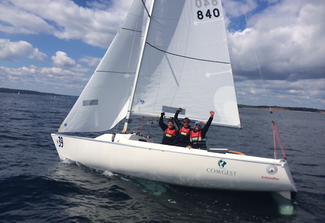 C’est ce samedi que les concurrents du Mondial IFDS 2014 ont disputé le dernier jour de régates. La tension était au maximal d’autant plus que la journée démarre, comme les prévisions l’avaient annoncé, avec un vent quasi nul. C’est l’attente qui commence: trois heures sur l’eau à espérer la moindre brise. Dix minutes avant la fin de l’heure réglementaire, le comité envoie une procédure de départ et les Sonars se lancent sur le plan d’eau. Deux coups de corne de brume sonnent: rappel général. Mais étant donné l’heure, le comité ne peut relancer une nouvelle procédure. C’est donc la fin de la journée pour les dix-huit équipages et le sacre de l’Equipe de France Sonar pour son deuxième titre consécutif de Champion du Monde. C’est avec un rappel général qui les avait mis en difficulté, que Bruno Jourdren, Eric Flageul et Nicolas Vimont-Vicary avaient démarré la semaine et c’est dans les mêmes conditions qu’ils la terminent sur la plus haute marche du podium. Ils devancent les Canadiens et les Australiens qui ont été de féroces adversaires.