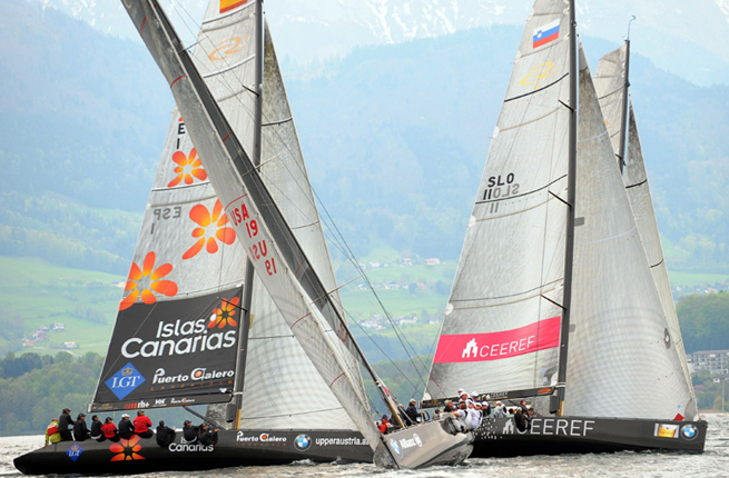 Les dix RC 44 participant à la Coupe d’Autriche ont disputé ce samedi un tour du lac Traunsee, mais qui n’avait pas de valeur au niveau du championnat. Le vent est resté assez faible, mais la course était âprement disputée. Team Ceeref, avec Rod Davis au poste de tacticien a pris un bon départ et a pu prendre la tête en bien se positionnant sur l’eau devant BMW Oracle et No Way Back. Par contre, Torbjorn Tornqvist sur Artemis a tenté ses chances sur l’autre côté du plan d’eau – un choix qui s’est avéré être le mauvais.