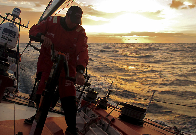 Résultat, Camper est en tête depuis hier, car il est plus proche du waypoint par rapport auquel est calculé le classement. Sa position ne plait pourtant que moyennement à Hamish Hooper, qui voit le verre à moitié plein. « Ce matin, on voyait Puma à l’horizon, mais ils ont depuis disparu plus au sud pour rejoindre Telefónica et Groupama dans leur quête pour aller le plus à l’est possible. Le verdict du jour était plus ou moins positif jusqu’à ce que, après le crépuscule, on heurte un ralentissement de huit km. Un navire de recherche de pétrole qui halait 14 câbles de 8000 mètres derrière lui, avec deux vaisseaux qui l’escortaient, a traversé en plein devant nous. Pas d’autre choix que de changer de route pour les contourner par l’arrière – un mouvement dont Nico pense qu’il nous a fait perdre cinq milles sur Puma, Telefónica et Groupama. Ce n’est pas ce dont on avait besoin mais voilà la vie de ceux qui naviguent dans des eaux riches en pétrole ! Et ils doivent être riches puisqu’on peut voir des plates-formes pétrolières à l’horizon, des flammes qui brulent haut dans le ciel et ce qui semble être des villes sur l’océan. »