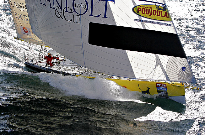 « Le parcours est défini avec Sylvie Viant de l’UNCL, après ils te tracent avec le standard C pour vérifier que tu le réalises bien. Dans tous les cas, c’est en concertation avec l’équipage, de manière à ce que ce soit utile, le but pour nous étant bien entendu d’aller chercher du vent. Comme il y en avait du côté de La Corogne, nous sommes allés là-bas ». Bonne pioche, Cheminées Poujoulat a surfé dans 40 nœuds de vent et utilisé à peu près l’ensemble de sa garde-robe : grand spi, grand genak, solent, trinquette, un ris, deux ris… du sport et de la manœuvre au menu.