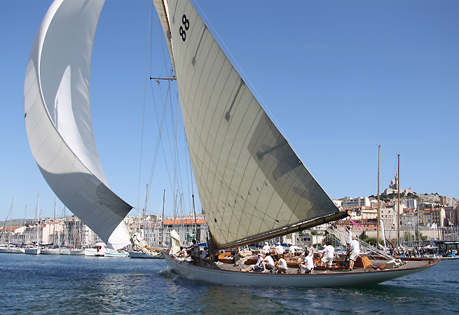 Même scénario que les jours précédents à Marseille, avec l’entrée du thermique sur les coups de 12h30, qui a permis de lancer la course du jour dans le cadre des Voiles du Vieux Port. Le choix du parcours s’est porté sur un petit triangle dans la rade sud. Cela n’a pas empêché le vent de jouer des siennes et bloquer toute la flotte sur la bouée Canoubier Soudaras, la première marque après la bouée de dégagement. Quelques refus de priorité plus tard, les bateaux se relancent pour arriver sur le coup des 16h, avec une ligne d’arrivée anticipée… en vue d’une remise des prix pas trop tardive. En temps réel, Moonbeam IV fait la loi chez les « gros », tandis que Maria Giovanna II l’emporte chez les petits.