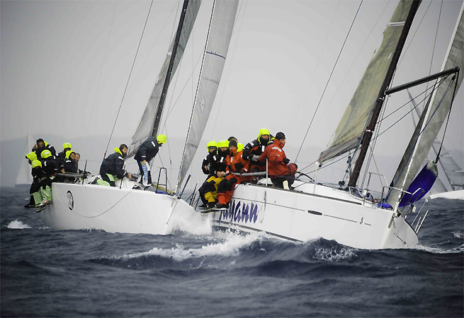 12 noeuds fraîchissant en début de manche, le vent s’est considérablement renforcé pour s’établir à 25 noeuds et 30 en rafale. La casse et les abandons ont jalonné les 3 manches de ces parcours banane. De nombreux bateaux ont déchiré leur spi. La première manche a été marquée dans le groupe 2 par une guerre fratricide entre Sayann Madraco et Géranium Killer. Sayann Madraco effectue des figures de styles et reste couché au tapis, durant 20 secondes. Il ne remettra plus son spi. Near Miss indéboulonnable confirme sa première place dans le groupe 1 au général du jour. A 9,5 noeuds de vitesse moyenne, le TP 52 pulvérise son concurrent Speedy dans la cinquième manche. Encore une belle prestation de l’équipage Natalia qui confirme sa première place IRC1 en finesse et délicatesse à l’image de son skipper : Natalia Brailoiu.