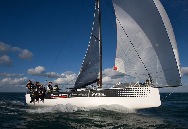 Le nouveau voilier « Courrier Dunkerque » a effectué hier sa première navigation en baie de Quiberon par 15 à 20 nœuds de vent et sous un grand soleil. Les Champions du Monde Farr 30 2010, après avoir réalisé un chantier sur leur nouvelle unité de course, ont testé pour la première fois leur M34, nouveau bateau du Tour de France à la voile. Ils enchaîneront pendant dix jours les tests à partir de l’Ecole Nationale de Voile de Quiberon. « Nous avons testé la structure du bateau, sa fiabilité » déclare Daniel Souben. « Et puis nous commençons à se répartir les tâches à bord et à se coordonner. C’est un grand plaisir de découvrir notre nouveau bateau ».