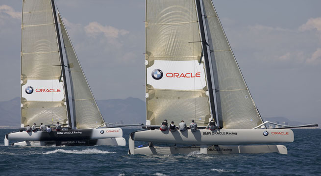 L’équipe de BMW Oracle continue de s’entraîner à bord de deux Extreme 40 à Valence. Neuf courses seront organisées cette semaine entre les équipages de Russell Coutts et James Spithill. Hier, le temps était parfait avec 14 nœuds de vent, qui permettait aux catamarans d’atteindre une vingtaine de nœuds au portant. Franck Cammas était à la barre du bateau de Coutts avec le néo-Zélandais, Jonathan Macbeth et l’Italien, Alberto Barovier. En face avec Spithill, John Kostecki occupait le rôle de tacticien aux côtés du néerlandais, Dirk de Ridder et le néo-Zélandais, Alan Smith. Les équipages resteront les mêmes le long de la semaine, mais ils vont échanger leurs bateaux au terme de trois journées de courses.