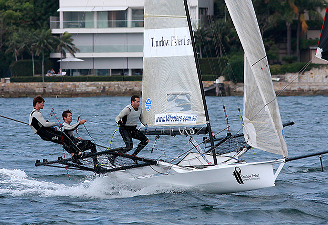 L’équipage de Thurlow Fisher Lawyers formé par Michael Coxon, Aaron Links et Trent Barnabas est d’ores et déjà assuré de garder son titre de champion d’Australie de 18 pieds après avoir remporté une nouvelle victoire aujourd’hui dans le port de Sydney. Malgré la détermination de Jack Macartney et son équipage sur The Rag, Thurlow Fisher Lawyers a marqué sa troisième victoire en quatre manches et mathématiquement ne peut plus être rattrapé au classement lors de la dernière épreuve la semaine prochaine. Coxon et ses hommes sont arrivés avec une avance d’une minute et 10 secondes sur The Rag avec Seve Jarvin sur Gotta Love It en troisième place.