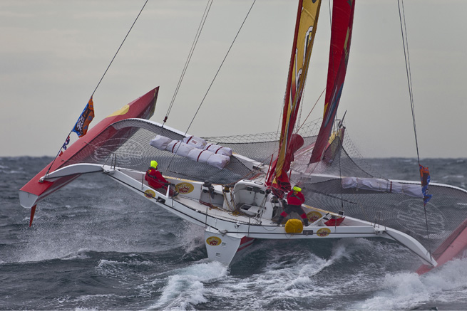 Même si Crêpes Whaou ! est bien calé en tête de la Transat Jacques Vabre, le multicoque a néanmoins subi le contrecoup de 48 heures éprouvantes. Franck-Yves Escoffier, d’ordinaire si mesuré et rassurant dans ses propos, n’a pas caché que les conditions qu’ils viennent de vivre à bord de Crêpes Whaou ! étaient dantesques. Pour ajouter au stress, le moteur ne tenait plus que par un goujon, sur les trois qui devaient le maintenir au plancher et menaçait de défoncer la coque à tout moment. « Nous avons eu des creux de 6 à 7 mètres, des vagues dans tous les sens, avec un vent de 40 nœuds et un moteur qui se fait la valise ! C’était vraiment dur. Nous guettions chaque vague et suspendions notre respiration à chaque fois que le bateau décollait et retombait ».