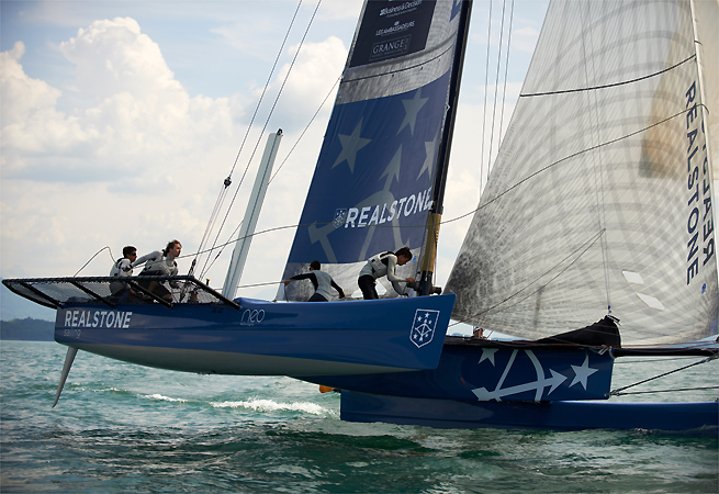 Dès le début, Realstone Sailing a fait preuve d’une stratégie bien pensée, avec un départ plutôt sous le vent de la flotte des D35, se laissant très vite glisser vers la côte suisse, « écrasant » petit à petit deux adversaires sous le vent. Notons également un très beau départ de Boris Lerch, à la barre de Veltigroup, qui a également fait un parcours remarquable dans le peloton de tête.