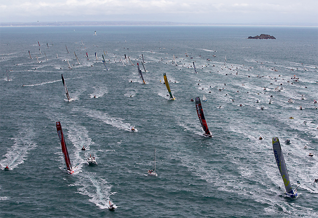 Les Imocas et Multis 50 se sont dispersés avec 2 options principales, ceux qui sont remontés en milieu de Manche pour limiter les changements de bord et ceux qui ont opté pour une route plus proche de la route directe, au large des côtes nord de la Bretagne mais avec un angle au vent plus défavorable et plusieurs changements de bords à effectuer. Avec un vent très irrégulier à l’arrière du front et une mer forte et désordonnée, la tâche n’est pas simple et les vitesses de progression ne sont pas optimales. La plupart des navigateurs des class 40 et Rhum étaient régroupés à quelques milles au nord de la pointe bretonne au lever du jour. Sur cette zone, les vents ont nettements faiblis à l’arrière du front avec un régime d’ouest très irrégulier. La plupart entament une descente tribord amure vers la mer d’Iroise avec des conditions de mer particulièrement difficiles.