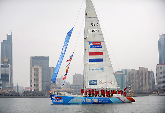 Le 68 pieds représentant les Pays-Bas, De Lage Landen vient de signer sa première victoire d'étape dans le tour du monde des clippers en franchissant la ligne d’arrivée à Qingdao à 0h51. Il lui a fallu 18 jours pour boucler cette étape de Singapour à la Chine, qui était marquée par l’intervention de l’équipe lors de l’opération de secours mise en place pour transporter à l’hôpital un marin de Gold Coast Australia qui s’était cassée la jambe samedi dernier. Geraldton Western Australia a été le premier clipper à arriver à Qingdao à 0h28 (heure française), mais à cause de l’incident de ce week-end, l’équipage sur De Lage Landen s’est vu offert une réparation de 7 heures et leur heure d’arrivée officielle est donc 17h51.