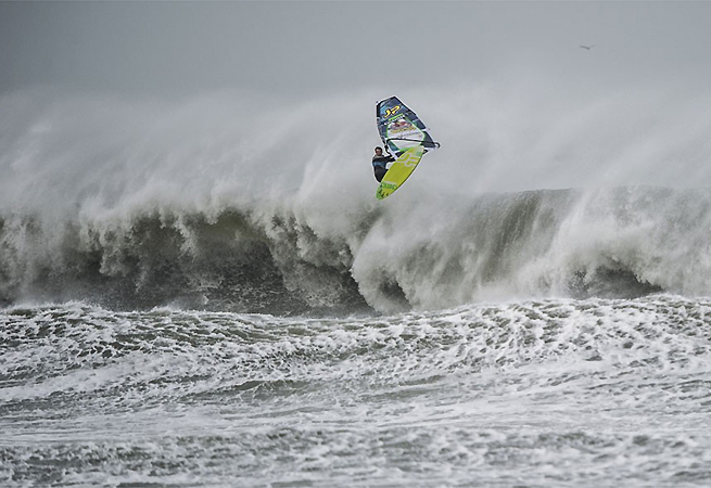 Les véliplanchistes les plus extrêmes se sont rassemblés à Gwithian en Cornouailles britannique hier pour une nouvelle étape de la Red Bull Storm Chase. Les participants et organisateurs cherchent des conditions extrêmes pour ces épreuves et avec les conditions actuelles les ont certainement trouvées. Des rafales de 60 noeuds et une houle de 10 mètres testaient les compétences des véliplanchistes. Si les photos sont spectaculaires, les gardes-côtes et autorités maritimes ont exprimé leurs réticences avant le début de l’épreuve.