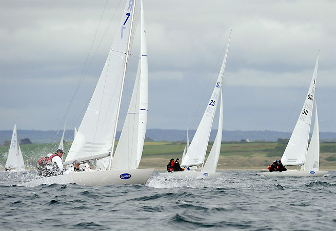Aujourd’hui, en baie de Douarnenez, les conditions étaient beaucoup plus navigables qu’hier. Aux dires des marins, on touchait même l’idéal de la proue. S’il faisait encore frisquet, le vent soufflait moins fort et les concurrents du Grand Prix Guyader Dragon se sont régalés sur une mer qui s’était assagie dans la nuit. Après un rappel général à 11 heures 30, le Comité a pu lancer une première course 10 minutes plus tard. C’est toujours la même histoire sur les régates et encore plus pour celles de Dragon, un bon départ est fondamental, il détermine 50% du résultat. Alors, au petit jeu de ‘qui perd gagne’, la pression montant au fil des courses, une poignée de Dragonistes tentent leur chance et entrainent quelques autres dans leur sillage. Parfois ça passe, d’autre fois, ça casse… Et hop ! Retour à la case départ.