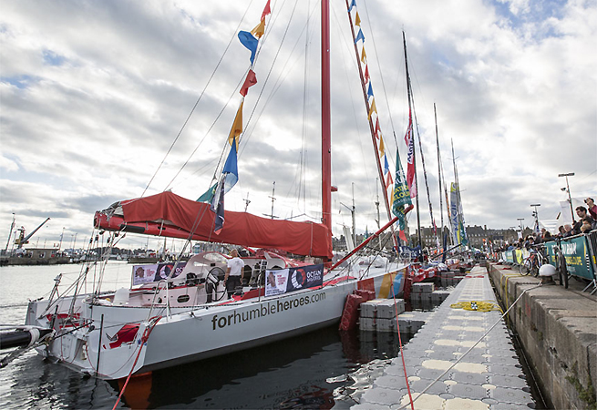 Armel Tripon sera au départ de Saint-Malo dimanche prochain à bord de l’IMOCA For Humble Heroes. Ce sera sa première grande course à bord du 60 pieds. Pour préparer l’analyse météo, il échange des idées idées avec Fabien Delahaye. Les deux hommes se connaissent bien et dans les salons d’un hôtel malouin, les ordinateurs des deux marins tournent sur les fichiers de vent et les simulations des premiers jours de course.