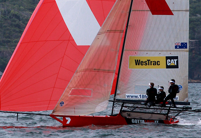 Les champions en titre du Trophée JJ Giltinan, Seve Jarvin, Sam Newton et Scott Babbage consolident leur position au sommet de ce championnat des 18 pieds australiens. Gotta Love It 7 a en effet franchi la ligne d’arrivée ce mercredi avec une avance de 5 minutes et 2 secondes sur leur plus proche adversaire, Mojo Wine. Thurlow Fisher Lawyers (Michael Coxon) qui a remporté la troisième manche hier, a dû se contenter de la septième place aujourd'hui à Sydney. Au terme de quatre courses, Gotta Love It cavale en tête du classement avec seulement 5 points devant Mojo Wine (17 points) et Appliancesonline.com (18 points).