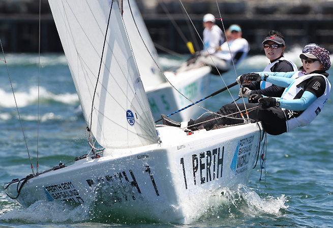 Le Championnat du Monde de l’ISAF a démarré ce samedi avec du match racing. Les conditions étaient éprouvantes à Fremantle avec une forte chaleur et des températures qui atteignaient 36°. Cependant l’Américaine Anna Tunnicliffe était en forme remportant ses trois matches. La journée a commencé avec un duel très serré qui opposait l’Australienne Nicky Souter à l’équipe portugaise. Souter s’est affirmée à quelques mètres de la ligne d’arrivée pour remporter ce match. Légère déception dans le camp français où Anne-Claire Le Berre n’a gagné que deux de ses quatre duels ce samedi. Demain ce sera le Groupe B qui entre en lice avec notamment la participation de Claire Leroy.