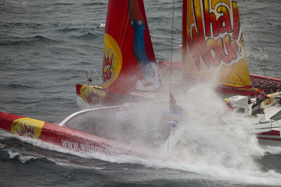 Après avoir perdu l’étrave de la coque centrale de Crêpes Whaou ! hier, Franck-Yves Escoffier progresse à moins de 3 noeuds et tente de gagner dans le nord pour trouver une mer plus calme afin d’effectuer une réparation de fortune, qui lui permettra de rejoindre la Guadeloupe dans les meilleurs conditions possibles tout en préservant au maximum son bateau. Joint ce midi lors de la vacation officielle, il parlait des dégâts. « Vu comme ça s’aggrave, j’ai beau tourner le problème dans tous les sens, je ne vois pas trop comment faire avec mes petits bras. Il faut éviter la voie d’eau mais aussi essayer de ne pas trop abîmer d’avantage l’étrave. Je ne trouve pas de solution pour le moment. Mettre une voile ? Oui, mais il y a de l’eau à l’intérieur… Je suis donc plus ou moins en stand by. Je progresse à 1,9 nœud. A ce rythme là, il faudra 25 jours pour rentrer donc ça ne va pas être évident. Il manque entre 120 et 150 centimètres d’étrave sur toute la hauteur. Je ne vais pas reboucher ça avec des torchons et des serviettes. La coque s’épluche tranquillement mais sûrement… »