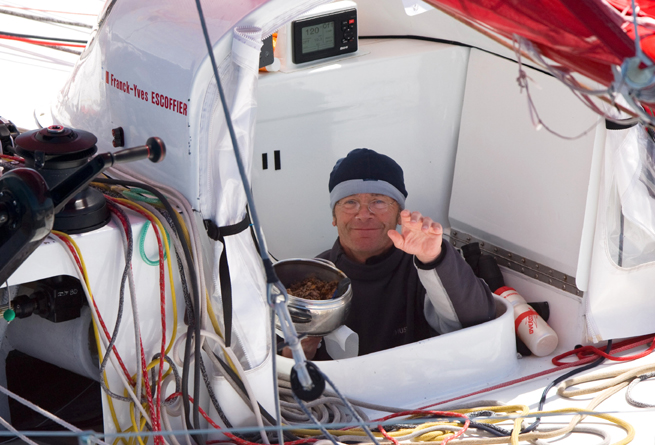 Franck Yves Escoffier (Crêpes Whaou!) joint ce matin : "La mer n’a pas très bel état, et après avoir passé le front j’étais d’une sacré humeur… Quand tu vois ton concurrent direct revenir autant tu as un peu les boules. La mer était forte et le vent aussi. J’ai fait des choix de voiles pas très judicieux et après j’étais fâché, donc je suis allé me coucher. Avant le pointage je viens de dérouler la trinquette avec 2 ris dans la grand-voile. Ce n’est pas le temps que j’aime sur ce genre de multicoques. Ce n’est pas la tempête, mais la mer est toujours un peu croisée, ce n’est pas établi. Ce n’est pas marrant mais ça fait partie du jeu, mais avec ce bateau je n’aime pas, je préférai être en monocoque ou à bord de mon vieux Gamin !"
