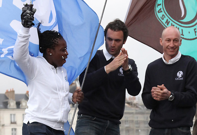 A 8 jours du départ de la Solidaire du Chocolat, le class40 Geodis a été baptisé hier par Gévrise Emane, Championne du Monde de Judo 2011 en présence des deux skippers Fabrice Amedeo et Armel Tripon. Fabrice Amedeo, skipper du voilier Geodis : « Je suis très heureux que Gévrise soit la marraine de notre bateau. Nous espérons que le magnifique palmarès de Gévrise ainsi que son mental de combattante nous portera chance.» Le départ de la transat en double et sans escale entre Saint-Nazaire et le Yucatán sera donné dimanche prochain. Devant les étraves un parcours de 5 000 milles avec une porte au nord de l’arc antillais. La course attire un plateau de choix avec la participation de 22 skippers dont Tanguy De Lamotte, Adrien Hardy, Yannick Bestaven, Eric Drouglazet et Sébastien Rogues.