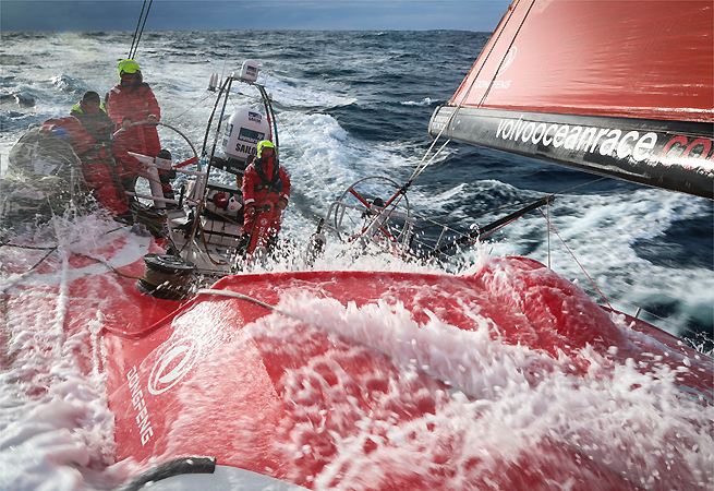 Depuis le premier classement de ce jeudi matin, tout change dans la Volvo Ocean Race. Le bateau franco-chinois était beaucoup plus rapide que ses adversaires au nord. Il progressait à plus de 11 noeuds, tandis que les quatre VOR65 à son nord n’avaçait plus qu’à 6 noeuds. C’est ainsi que Charles Caudrelier et ses hommes raflent la première place dans le classement officiel par rapport à la distance au but. Autre gagnant de la matinée, Team SCA qui reprend une trentaine de mailles à leurs adversaires car pas encore ralenti dans la zone de vents faibles et instables.