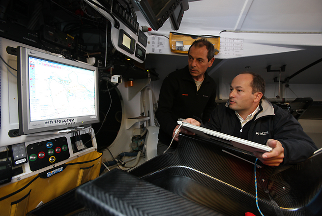 A cette époque de l’année, deux scénarios sont envisageables sur l’Atlantique. Le premier, le plus probable, est un flux d’ouest perturbé avec un passage de front au nord des Açores. Quant au second, loin d’être négligeable, il est marqué par la présence d’un anticyclone sur l’Irlande ou sur les îles Britanniques qui produit des vents de nord-est en Manche, puis jusqu’au milieu de l’Atlantique. Pour Marc et Yann, effectuer un solide travail en amont du départ est essentiel car une fois en mer le routage est interdit. Ce sera dans les tout derniers instants, avant le coup de canon, que la stratégie de la course se dessinera réellement. Marc Guillemot confirme que « les premières décisions pour aborder la sortie de la Manche seront prises le matin du départ ». Une fois en mer, il faudra comme toujours s’adapter.
