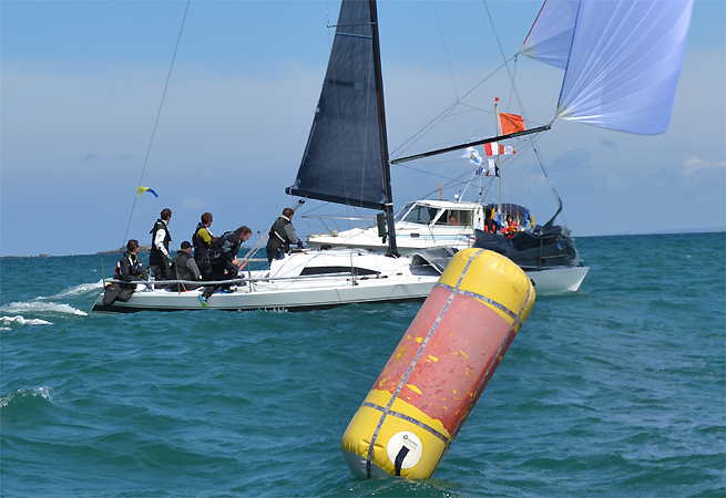 Les conditions météo étaient superbes : vent de nord-ouest de 15 à 20 nœuds, creux d’environ 50 cm et courant portants au large à l’aller. Conséquence : les équipages qui ont pris l’option de s’éloigner des côtes au début de l’épreuve ont pris un net avantage sur les autres. Le retour s’est fait au portant, sous spi. A 16h20, Swuzzlebubble passait la ligne d’arrivée en premier, suivi, 9 minutes plus tard, de Brittany Drizzle puis de Général Tapioca. 5 à 7 nœuds de moyenne à l’aller et 7 à 8 nœuds au retour, avec des pointes à 12 ou 13 nœuds et de belles phases de surf sur la fin du parcours puisque le courant et la houle étaient favorables.