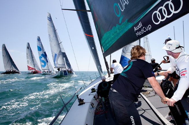 Les sept TP52 sont sortis devant Cascais ce mardi pour un dernier entraînement commun dans une brise plutôt légère : l’occasion de régler les derniers détails techniques à bord, mais surtout de coordonner les équipiers dans des conditions très exigeantes car très variables. Les équipages de l’Audi MedCup ont enchaîné trois départs pour s’échauffer, et un tour de piste pour se confronter. Difficile d’en tirer des conclusions au vu d’une brise de secteur Sud-Ouest à Ouest qui n’était pas franchement établie, basculant de plus de 25° avec une tendance à tourner vers le Nord-Ouest, et oscillant entre cinq et neuf nœuds pour se renforcer à une douzaine de nœuds… quand les bateaux rentraient au port.