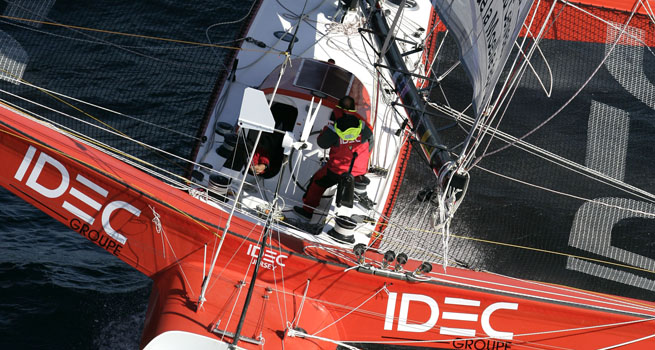 614 milles en une seule journée! Dans les Quarantièmes rugissants, par le travers des Kerguelen, Francis Joyon, à bord du maxi-trimaran IDEC, vient de battre le record des 24 heures en solitaire. A près de 26 noeuds de moyenne, donc (25,9). Le navigateur français Francis Joyon vient de s’adjuger un nouveau record du Monde, celui de la plus longue distance parcourue en 24 heures par un navigateur solitaire, avec le chiffre colossal de 614 milles parcourus entre hier et ce mercredi matin 12 décembre à 7 heures (françaises). Ce « chrono » devra faire l’objet d’une ratification par le World Sailing Speed Record Council. Le précédent record avait été établi le 6 aout 2006 par le trimaran de 60 pieds « Brossard » d’Yvan Bourgnon avec une distance de 610,45 milles.
