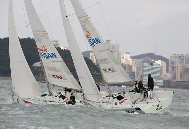 Après une journée perdue à cause de l’état de la mer, la compétition a redémarré ce mardi en Corée du Sud où se dispute la Busan Cup de match racing féminin.  Le vent est resté fort et les conditions éprouvantes hier, mais l’Australienne, Katie Spithill a tiré son épingle du jeu en ne s’inclinant qu’une fois dans ses sept duels du jour. Elle termine le Round Robin en tête du classement avec le score de 9 – 2. La journée était décevante pour Anne-Claire Le Berre Elle avait dominé la première journée de régates, mais hier a perdu trois de ses matchs pour terminer à la quatrième place avec le score de 5 – 3. Aujourd’hui il reste encore quelques duels à disputer dans le Round robin de cette épreuve qui marque la conclusion du circuit de match racing féminin 2014.