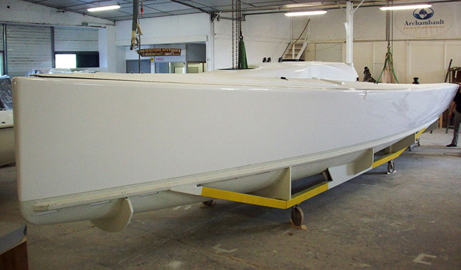 Ce jeudi est un jour important au chantier Archambault, car la coque du M34 n°1, le monotype du Tour de France à la voile 2011, vient de recevoir son pont accastillé. L’équipe attendait ce moment qui lui permet de vérifier la qualité des ajustages et de découvrir vraiment le bateau sur lequel elle travaille depuis de nombreux mois. Lignes d’eau tendues, franc-bord, tonture marquée, roof original, le M34 commence à dévoiler ses charmes mais il faudra attendre sa mise à l’eau pour vraiment le juger. En attendant, l’équipe continue à avancer avec les finitions sur le pont et l’intérieur du bateau. Sa première course officielle est prévue aux Voiles de Saint-Tropez.