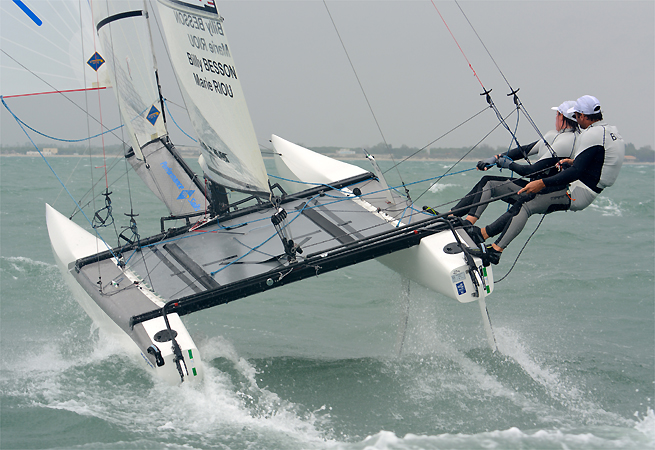 Billy Besson (FRA), Champion du monde en titre de Nacra 17 avec Marie Riou : « On est super fier d’avoir une grande compétition en France, et en plus, à La Grande Motte. Nous nous y sommes entraînés de nombreuses fois en Nacra et de mon côté, j’ai passé 6 mois ici l’année dernière avec le projet Hydros. Notre objectif est d’abord de valider du matériel : on a reçu un nouveau bateau que nous devons essayer en compétition. Depuis le début de l’année, parmi les 3 premiers, ça tourne souvent entre les Australiens Darren Bundock/Nina Curtis, les Italiens Vittorio Bisssaro/Silvia Sicouri et nous. »