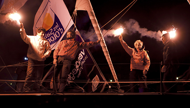 Extraordinaire moment cette nuit, lors de l’arrivée de Marc Guillemot aux Sables d’Olonne. Le skipper de Safran a invité pour la remontée du chenal ceux dont il a croisé la route dans sa carrière et qui ont abandonné dans ce Vendée Globe. Pour la première fois, un skipper ne remontait pas le chenal seul. “Je voulais juste partager ce moment” a indiqué Marc Guillemot. Sur le pont de Safran, Jean Le Cam, Roland Jourdain et Kito de Pavant faisaient virevolter les fumigènes avec Marc, pendant que Yann Eliès était tout près, sur un semi-rigide. Il montera lui aussi à bord ensuite, au ponton, ainsi que Sam Davies. Belle image !