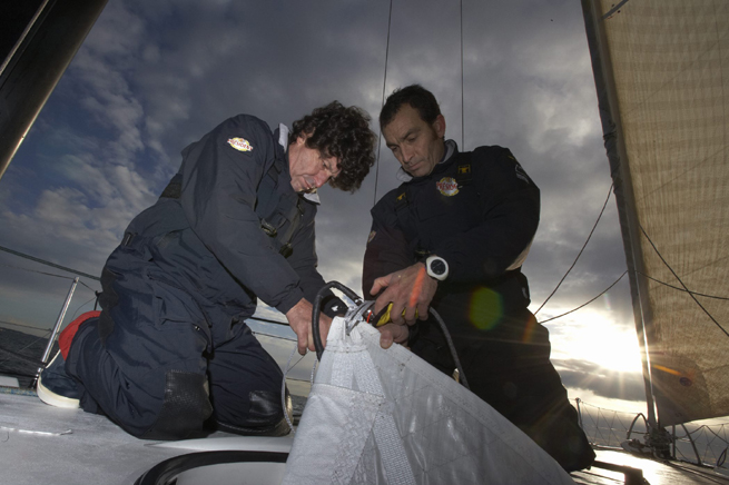 Bientôt une semaine que Jean Le Cam et Bruno Garcia sont à Mindelo, au Cap Vert, après le démâtage de leur 60 pieds dans la Barcelona World Race. Ils vivent à bord de Président et organisent le retour du bateau par cargo. « Nous dormons à bord. Nous avons fait notre rapport de mer, puis tout rangé, tout rincé, démonté l’accastillage qui peut l’être, fait un grand check up et ménage », explique Jean, qui ajoute : « vivre à bord résout les problèmes de gardiennage et limite les risques de vol… et comme il fait très beau ici, c’est parfaitement jouable ».