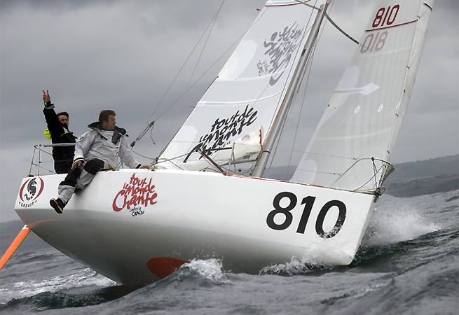 En bateaux de série, les deux leaders, « Teamwork » (Mettraux/David) et « www.runo.fr » (Mary/Barnaud), sans doute trop occupés à se marquer l’un l’autre, sont partis sur un long bord Nord qui risque fort de leur faire perdre la tête ! En effet, lorsqu’ils vont virer de bord, ils seront sur un bord refusant. Leurs poursuivants directs (« Matchbox » de Dréano/Leboeuf et « Diaoulic » de Leclech/Renault) sont mieux positionnés dans l’Ouest mais devront eux aussi se recaler vers le large et se rallonger ainsi la route. Le leadership pourrait donc revenir à deux autres duos, « Damien cherche sponsor » (Cloarec/Gresset) et « Tout le monde chante contre le cancer » (Belloir/Aubry) qui furent les plus extrêmes dans leur quête d’Ouest ce matin.