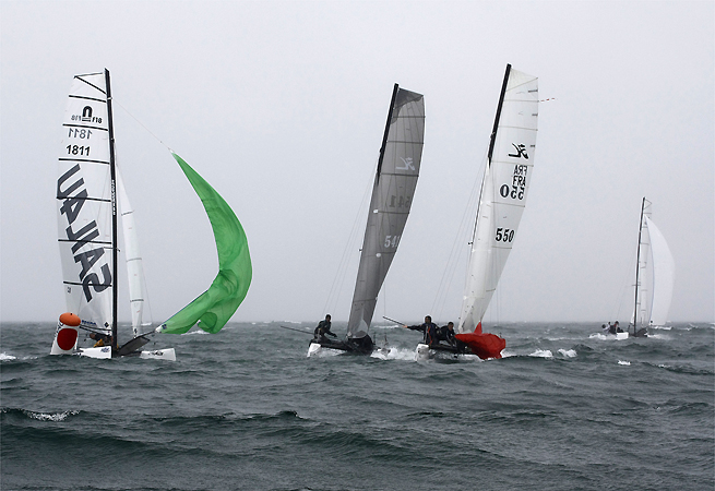 Les prévisions météo de ce matin n’étaient pas très favorables pour cette 2ème journée d’épreuve. En effet un vent de sud de 19 nœuds forcissant à 25 avec rafales jusqu’à 34 nœuds était prévu. Devant ces mauvaises prévisions, la direction de course a décidé de ne pas faire courir la longue distance et de lancer des courses à la place. Vers midi les présidents des comités de course C3/C4 et Flying Boats/Flying Phantom ont pris la décision de ne pas envoyer leurs compétiteurs sur l’eau, seule la série F18 s’est lancée dans une procédure de départ. Ils étaient 7 bateaux sur la ligne de départ de la première course du jour puis 15 sur la deuxième. L’équipage Perron/Robert a fait la bonne opération en remportant les 2 courses du jour, il se classe en tête du classement général provisoire. Il est suivi du duo Boulogne/Fanouillère puis de Duthil/Mourniac.