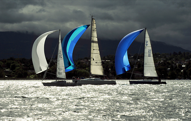 De superbes conditions de sud-ouest, force 5 bien établi, annonçant les premiers frimas de l’automne, accueillent les 105 concurrents dès le départ de la course au large de la jetée nord de la Société Nautique de Genève. Dans ces conditions de vent soutenues, les plus véloces parviennent à se démarquer rapidement. Au profit d’un excellent départ, Eric Beausse sur Ardizio (Luthi 33) prend le large devant les jeunes Lucien Cujean sur CER 3 et Patrick Girod sur Mordicus Girod Piscine, deux Surprise, qui se trouvent bord à bord avec les grands favoris de la course. Serge Patry, sur son Luthy 34 Perchette, déclarait haut et fort sur la ligne de départ : « Aujourd’hui, je ne vais rien lâcher pour défendre mon titre ».