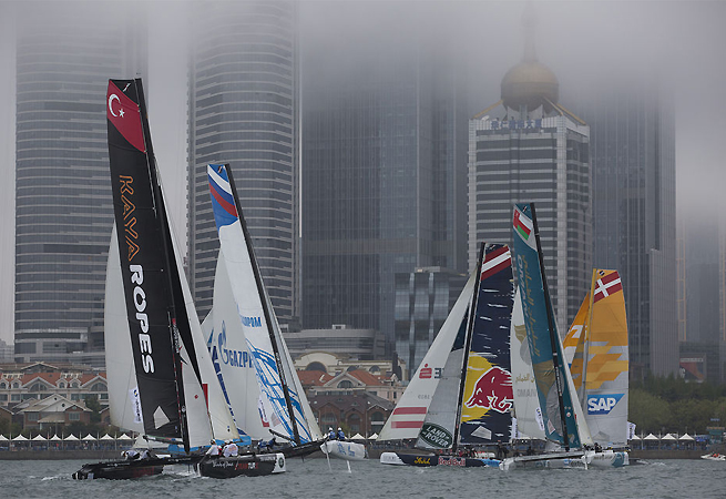 Après l’annulation de la première journée à cause du brouillard à Qingdao, ce vendredi neuf manches ont pu être courues par la flotte des Extreme Sailing Series, même si la visibilité était de nouveau réduite et le vent faible. Les départs étaient primordiaux et ce sont les Danois de SAP Extreme Sailing Team, menés par Jes Gram Hansen et Rasmus Kostner,  qui terminent la journée en tête du classement provisoire après deux victoires et un total de sept places sur le podium. La journée n’a pas bien démarré pour le champion en titre, The Wave Muscat, qui a pris du temps pour comprendre les bascules dans ces conditions légères. Mais à la fin de la journée avec une visibilité de nouveau réduite à moins de 100 mètres, Leigh McMillan et ses hommes ont retrouvé la forme pour se hisser à la deuxième place. Malgré une collision avec SAP Extreme Sailing Team lors de la première manche, Gazprom Team Russia a réalisé une bonne performance pour compléter le podium provisoire.