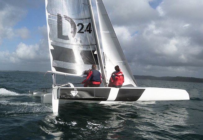 Les nouveaux trimarans de 24 pieds, les Diam 24 participeront à la prochaine édition du Grand Prix de l’Ecole Navale. Ces magnifiques plans de carènes signés VPLP (Van Peteghem Lauriot-Prévost) ont écumé la semaine dernière le plan d’eau du Poulmic durant deux journées bien remplies. Au programme, validation de l’utilisation du slipway, assemblage des coques et test de vitesse. Lors de séances dédiées à la voile, l’Equipe de France Militaire de Voile a pu faire “fumer” les étraves de ces trimarans qui ont atteint des vitesses étonnantes ! Du spectacle en perspective lors du prochain Grand Prix de l’Ecole Navale (28 mai-1er juin 2014), qui devrait voir sur ces lignes de départ entre 6 et 10 unités pour des parcours “express” en rade de Brest !