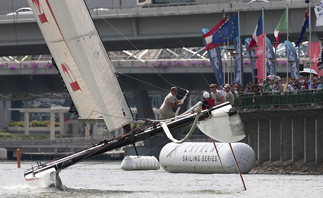Ce quatrième jour de course aura été plus qu’intense pour les 10 équipages engagés sur les Extreme Sailing Series Singapour, puisque le comité de course a profité que le vent soit aujourd’hui bien de la partie pour lancer pas moins de 11 manches. Pour la première fois la brise a dépassé les 10 noeuds, mais restait très variable. Lors de la huitième manche du jour, Red Bull, qui avait la priorité est entré en collision avec le tableau arrière de Team GAC Pindar provoquant la chute du numéro un, Craig Monk, qui est tombé à l’eau.