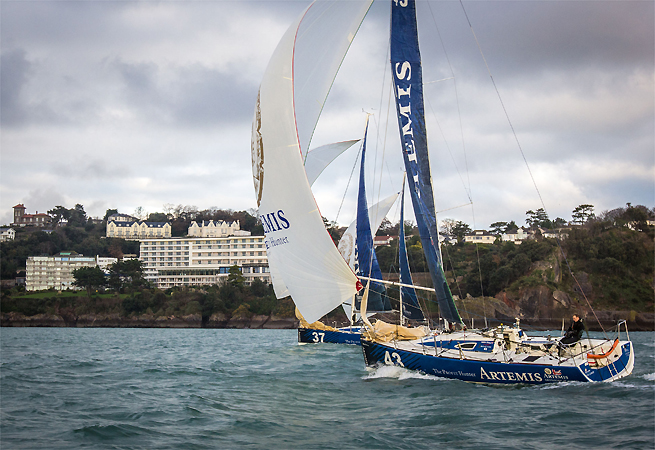 Après quatre mois d’entraînement à Cowes et à Torbay, la nouvelle promotion de l’Artemis Academy est arrivée à Lorient. Les jeunes Anglais, Robin Elsey, Rob Bunce et Andrew Baker vont s’entraîner avec Tanguy Leglatin. Ils ont effectué une première sortie ce mercredi en la compagnie de quelques Figaristes français. Premier constat : les conditions sont bien plus musclées au large de Lorient que dans les eaux abrités du Solent. Au début de 2015, il est fort probable que d’autres Anglais rejoindront les jeunes recrus, car Alan Roberts, Nick Cherry et Sam Matson veulent en effet profiter de ces séances. Pour le moment, les bizuths de la classe démarrent aussi leur apprentissage du Français, qui est important non seulement pour les semaines à venir, mais parce qu’ils savent bien que dans ce circuit, ils vont côtoyer l’élite, qui reste essentiellement française.