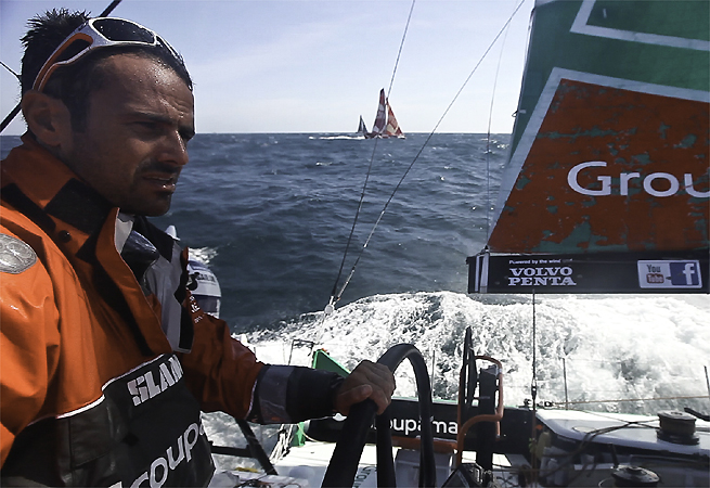Franck Cammas, skipper de Groupama, revient sur la victoire de son équipage dans le sprint vers Abu Dhabi : « On a eu une dernière opportunité au portant, on n’y croyait pas vraiment mais on a pu se décaler avec une risée et les dépasser ! On est très contents parce que c’est un très bon équipage. Groupama 4 est un bateau de brise, c’est sûr, et on attendait cette étape car les conditions météo annoncées étaient favorables. C’est normal de retrouver deux plans Juan K. devant, car ce sont des bateaux pensés pour ce genre de conditions. Plus qu’une revanche après notre fissure, c’est une revanche sur notre première partie d’étape – on était en position de gagner et on était très frustrés en arrivant. »